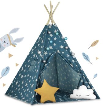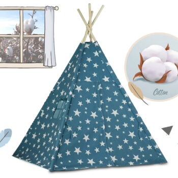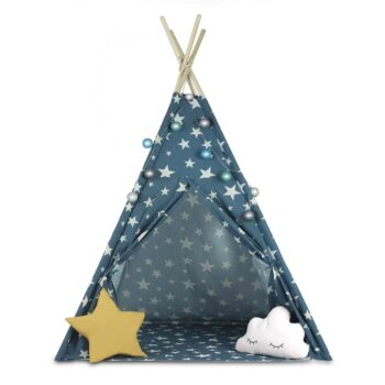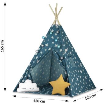 Vsak šef potrebuje svoj tipi! Otroški šotor v obliki indijskega tipija je uspešnica za okrasitev otroških sob. Glavne značilnosti: naravni materiali – varni in zdravi, umirjene barve z modnimi vložki, Montessori slog, enostavno zlaganje in zavzame malo prostora, stabilna konstrukcija, priloženi dve blazini, lučke in prevleka BREZPLAČNO. Brezplačne lučke k šotoru Priložene blazine v čudovitih oblikah! Vsak tipi ima komplet 2 blazin, vidnih na sliki! Zgradimo si svojo podlago! Komplet vsebuje: okvir – 4 lesene palice, baterijsko svetilko – baterije niso priložene, okensko zaveso, okno, drsne stene, nežno in zračno tkanino, 2 debeli talni blazini, prevleko. 100 % naravno Pri otroških izdelkih se splača izbrati naravne materiale najvišje kakovosti. Zato je naš tipi izdelan iz vrhunskega bombaža. Bombaž je kot nalašč za otroške šotore, saj odlično diha. Šotor je mogoče enostavno premikati, ko je zložen. Lahko ga postavite v skupni prostor kot igrišče ali na vrt za zaščito pred žgočim soncem. Tehnični podatki: dimenzije šotora: 120 x 120 x 165 cm, dimenzije palice: ø2,2 x 190 cm, blazine: 2 kosa, modra barva, teža bombaža: 175 g/m2, material palice: bor. superteepe