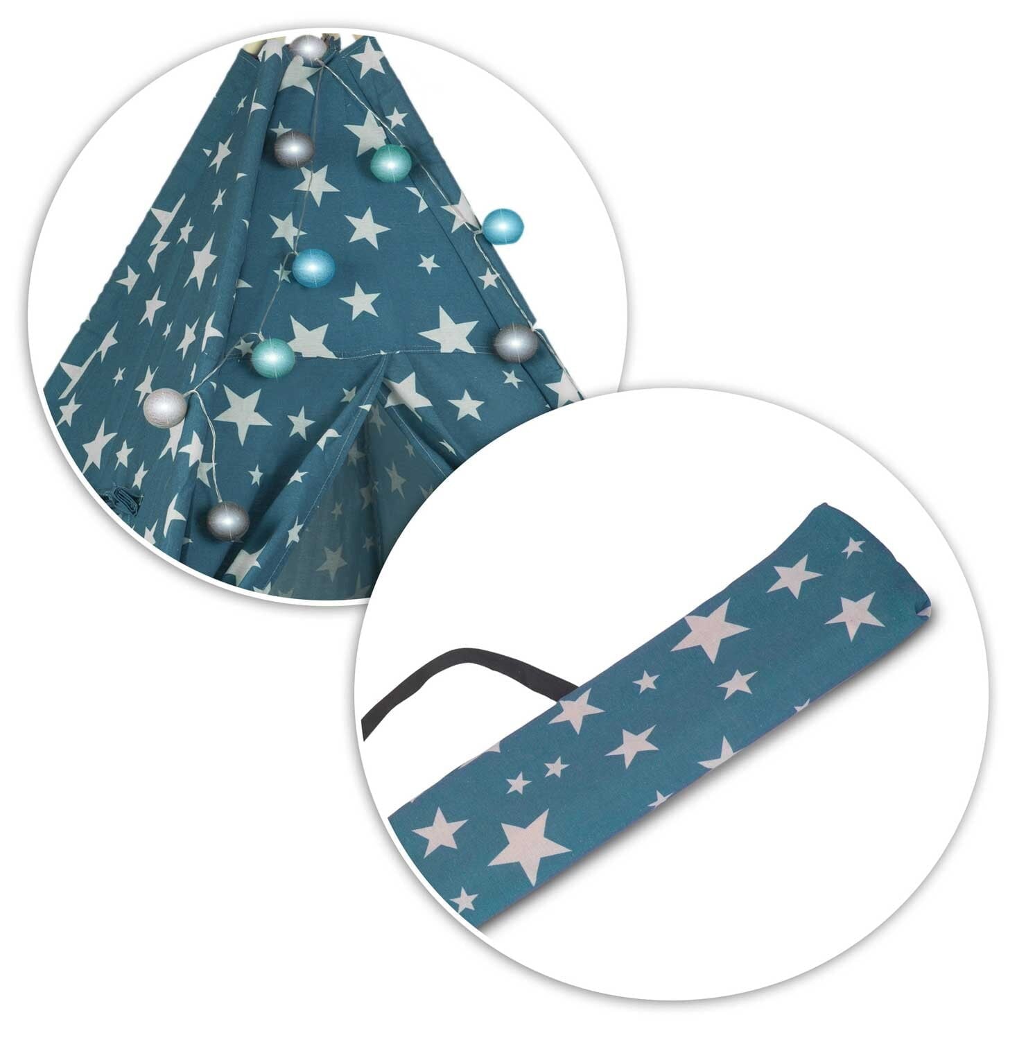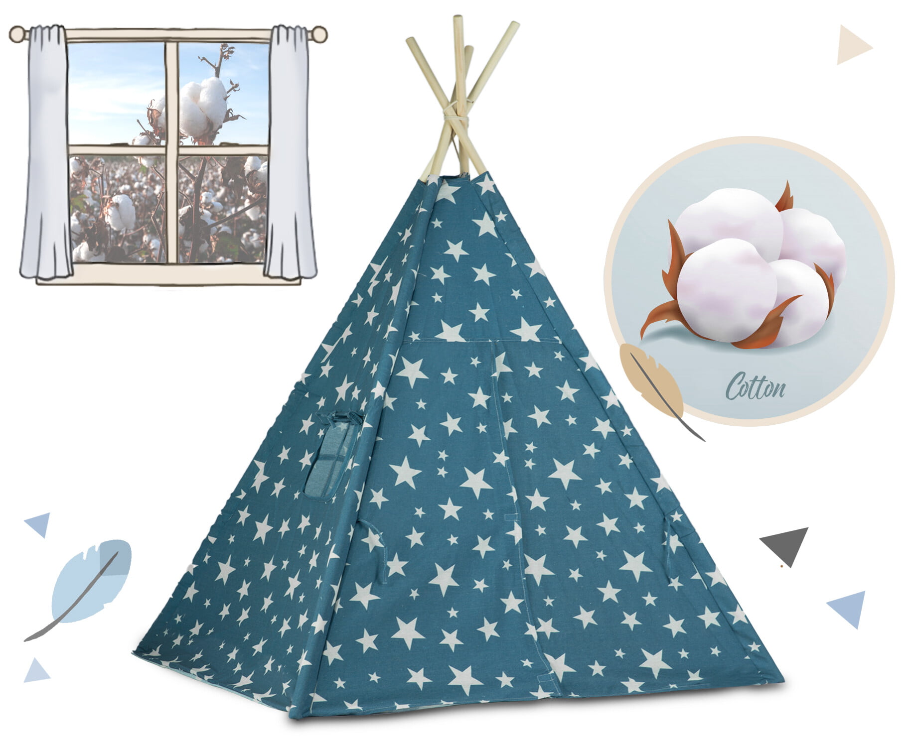 Vsak šef potrebuje svoj tipi! Otroški šotor v obliki indijskega tipija je uspešnica za okrasitev otroških sob. Glavne značilnosti: naravni materiali – varni in zdravi, umirjene barve z modnimi vložki, Montessori slog, enostavno zlaganje in zavzame malo prostora, stabilna konstrukcija, priloženi dve blazini, lučke in prevleka BREZPLAČNO. Brezplačne lučke k šotoru Priložene blazine v čudovitih oblikah! Vsak tipi ima komplet 2 blazin, vidnih na sliki! Zgradimo si svojo podlago! Komplet vsebuje: okvir – 4 lesene palice, baterijsko svetilko – baterije niso priložene, okensko zaveso, okno, drsne stene, nežno in zračno tkanino, 2 debeli talni blazini, prevleko. 100 % naravno Pri otroških izdelkih se splača izbrati naravne materiale najvišje kakovosti. Zato je naš tipi izdelan iz vrhunskega bombaža. Bombaž je kot nalašč za otroške šotore, saj odlično diha. Šotor je mogoče enostavno premikati, ko je zložen. Lahko ga postavite v skupni prostor kot igrišče ali na vrt za zaščito pred žgočim soncem. Tehnični podatki: dimenzije šotora: 120 x 120 x 165 cm, dimenzije palice: ø2,2 x 190 cm, blazine: 2 kosa, modra barva, teža bombaža: 175 g/m2, material palice: bor. superteepe