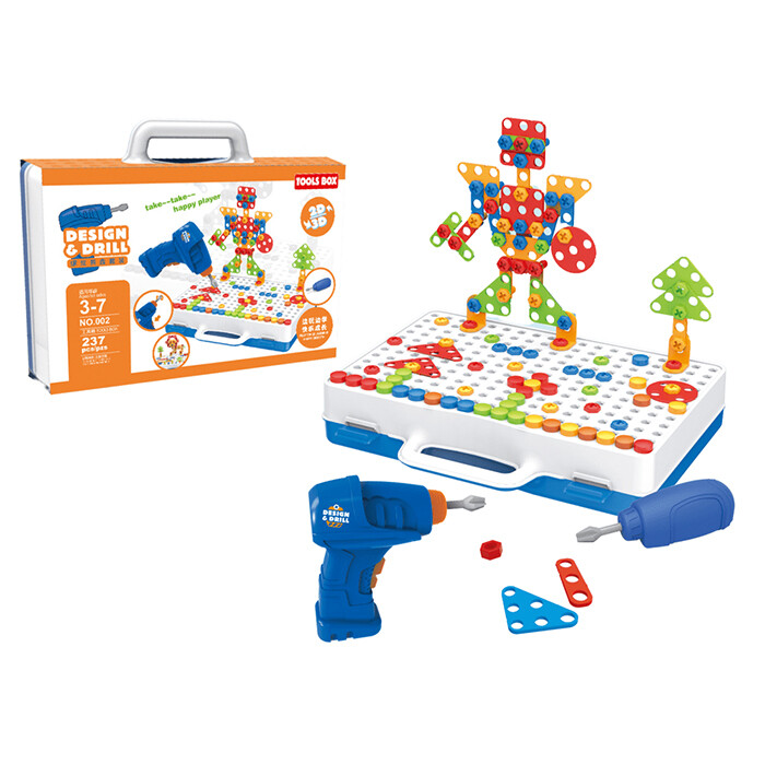Vsak mali graditelj bo užival v tej igrači. Spodbudila bo njegovo ustvarjalnost in motorične sposobnosti ter bo zelo zabavna. Igrača bo zaradi široke palete možnosti gradnje vašega otroka zaposlila za več ur, igranje pa se ne bo hitro dolgočasilo! Poleg tega uči potrpežljivosti in natančnosti. Izvijači omogočajo ustvarjanje ravnih in tridimenzionalnih vzorcev. Komplet je sestavljen iz 248 kosov in omogoča ustvarjanje neskončnega števila vzorcev zlaganja. Z vrtalnikom, ki je priložen kompletu, lahko dele privijate in odvijate, da ustvarite različne vzorce. Druga možnost je seveda izvijač; vijaki in podložke v različnih barvah pomagajo spodbujati vid in spodbujajo igro. Elementi kompleta: – akumulatorski vrtalnik – izvijač – vijaki – gradbeni elementi – plošča – etui Dimenzije embalaže: 31 cm x 20 cm x 6 cm Dimenzije vrtalnika: 15 cm x 15 cm x 5 cm Vrtalnik napajata dve bateriji AA 1,5 V. Primerno za otroke, starejše od 3 let. V skladu s standardom EN71 in certifikatom CE.