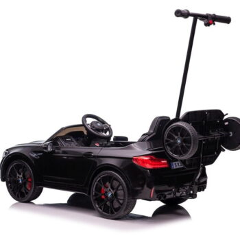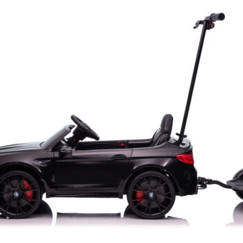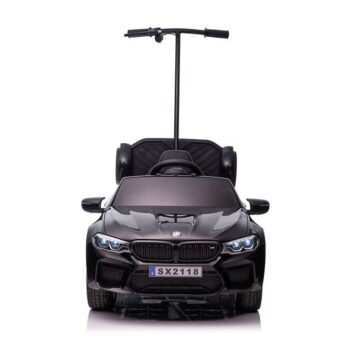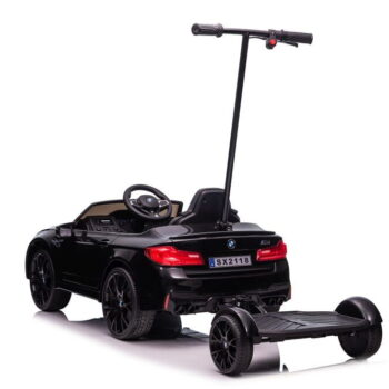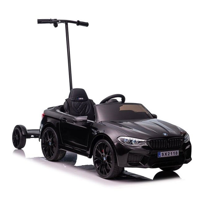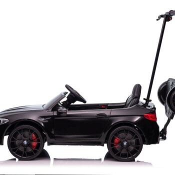 BMW M5 črne barve s starševskim stojalom – avtomobil na baterijski pogon