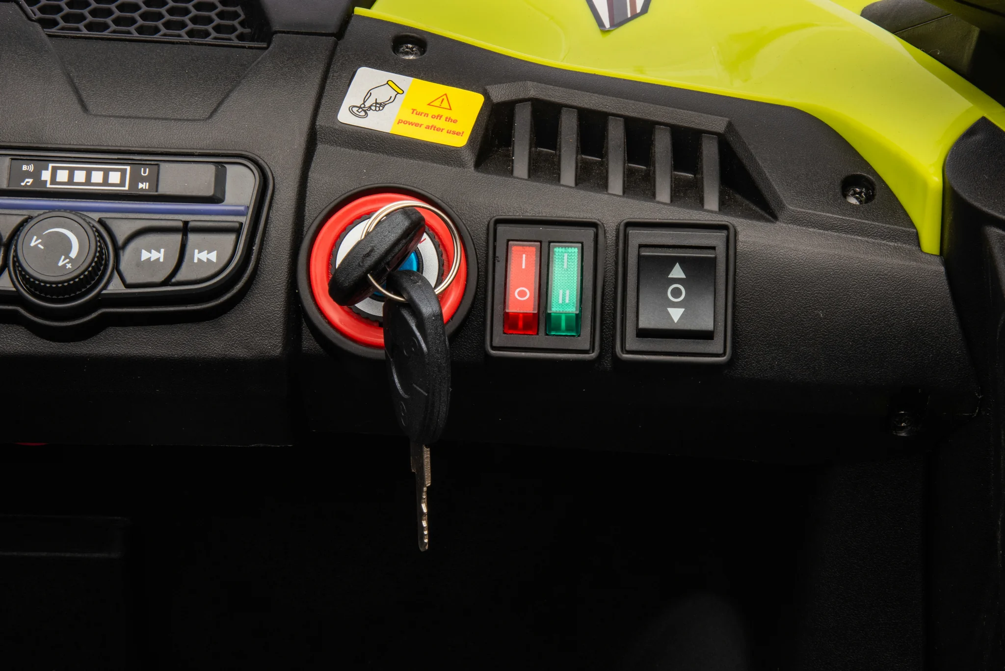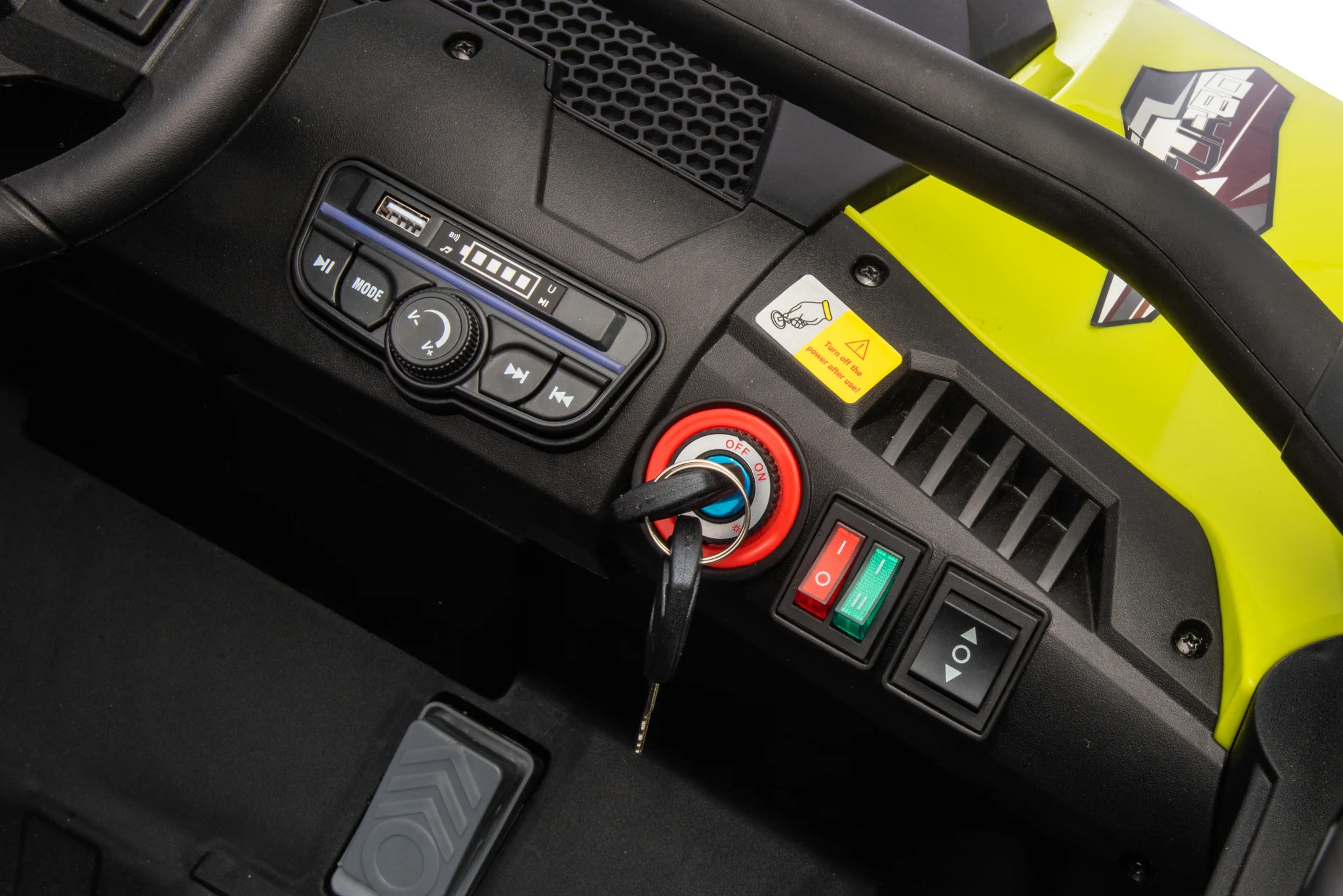 Dvignjeno vzmetenje, kovinski okvir in gumijasta kolesa zagotavljajo stabilno in udobno vožnjo, usnjeni sedeži , LED luči in glasbeni stereo sistem z Bluetoothom pa dajejo občutek pravega “terenskega” vozila. Starši so dodatno brezskrbni zaradi daljinskega upravljalnika, s katerim lahko kadar koli prevzamejo nadzor.