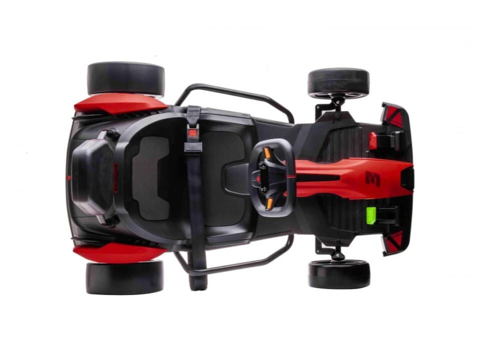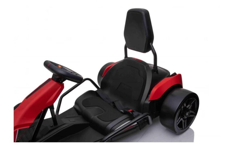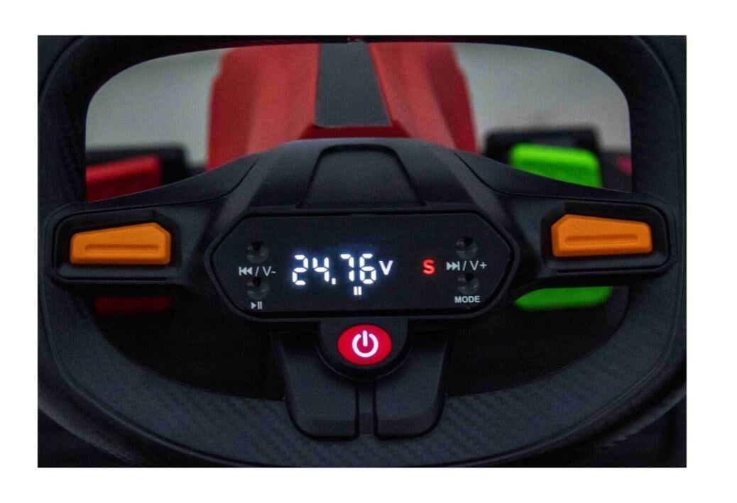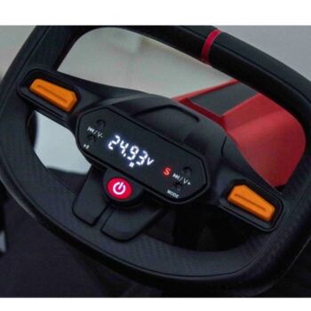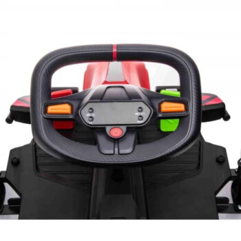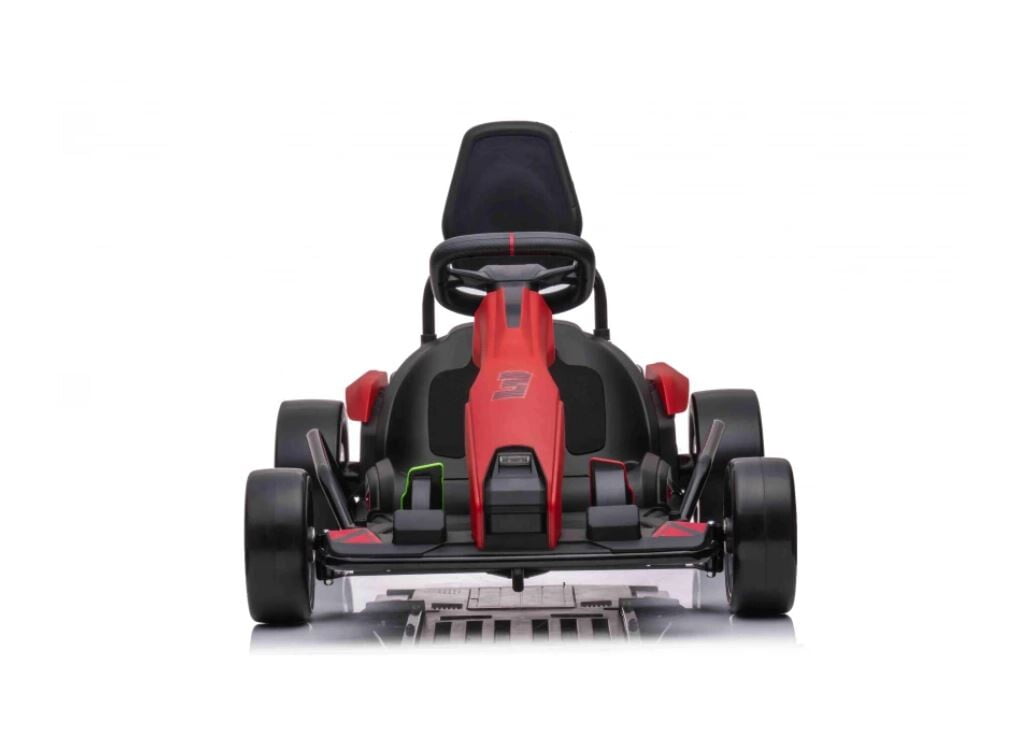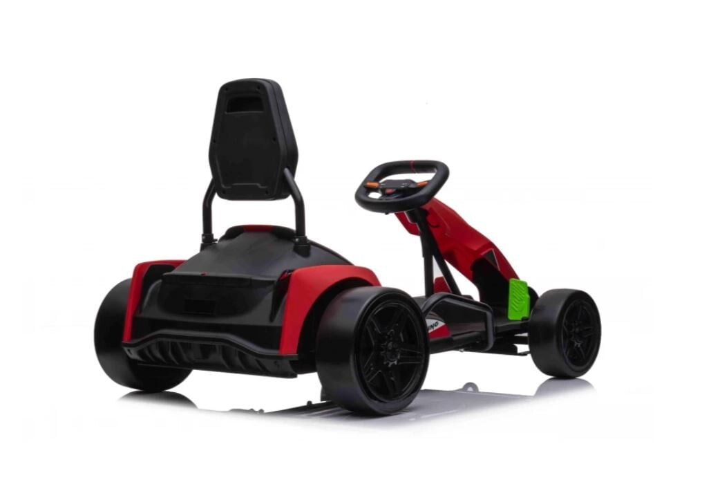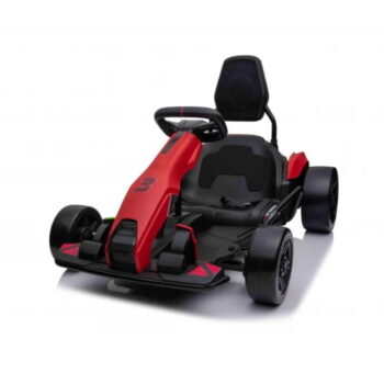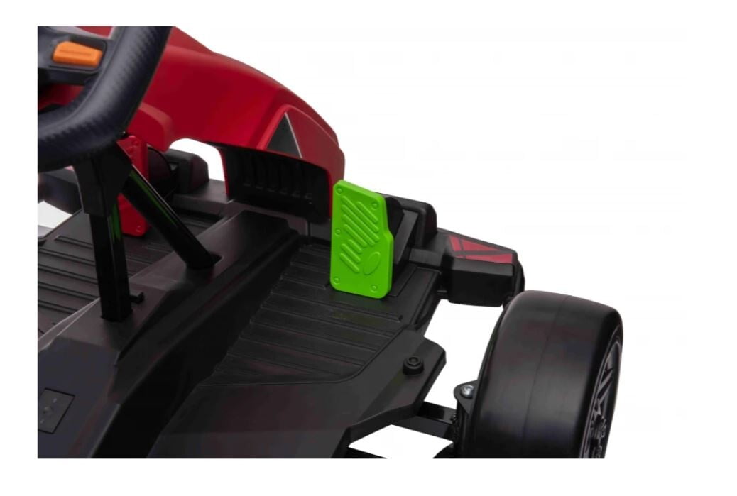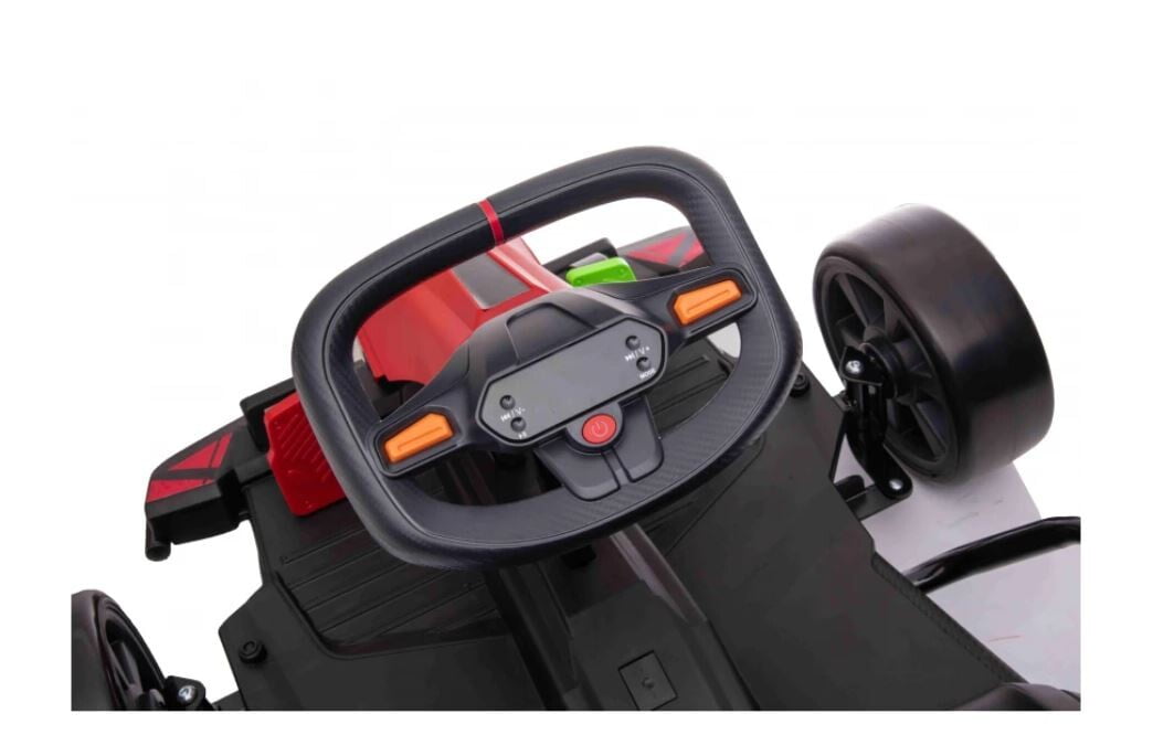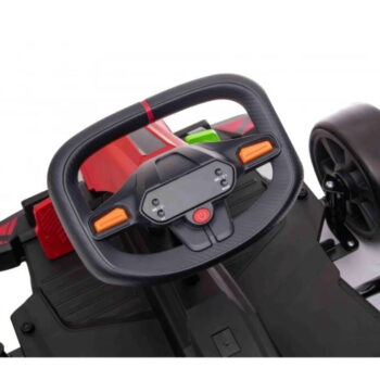 Število motorjev: 2 Moč motorja: 150W Število baterij: 1 Kapaciteta baterije: 24V/10AH Daljinski upravljalnik: ne Pogon: naprej, nazaj Število sedežev: 1 Material sedeža: prevlečen s peno Kolesa: guma Avdio plošča: Bluetooth FM radio: da Zvočni učinki: zagon motorja Luči: da Varnostni gumb STOP: ne Varnostni pasovi: da Mehki zagon: da Brez odpiranja vrat Indikator polnjenja: da Barva: rdeča Pobarvano: ne Dodatna oprema: funkcija driftanja Dodatki: obesek za ključe