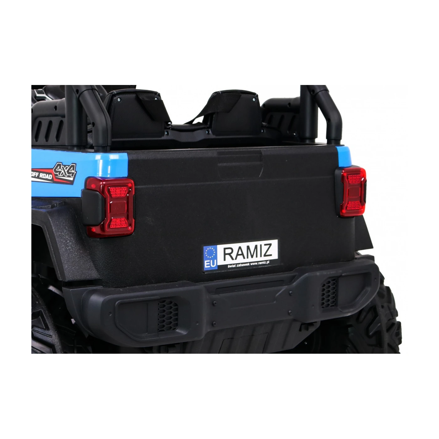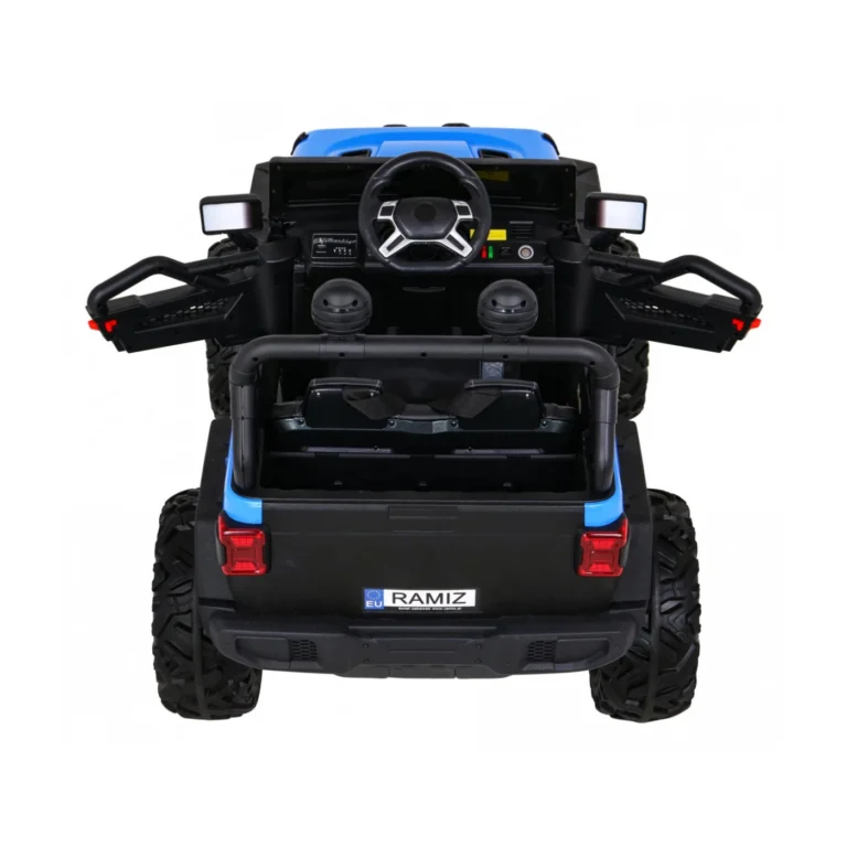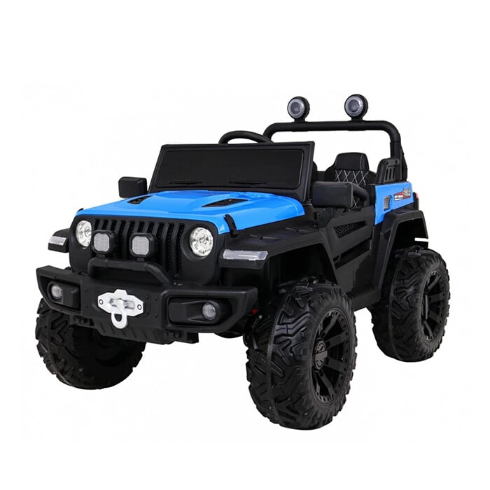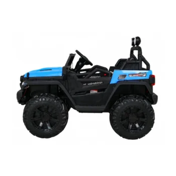 MODEL: Jeep Jet MOTOR: 4X45W BATERIJA: 1x12V 10Ah ŠTEVILO SEDEŽEV: dvosedežni MERE: dolžina 120 cm, širina 82 cm, višina 83 cm TEŽA: teža vozila – 25 kg, z embalažo – 26 kg, največja obremenitev – 50 kg OPREMA: daljinski upravljalnik 2,4 GHz, 3 hitrosti, varnostni gumb za zaustavitev, gumijasta kolesa, LED sprednje in zadnje luči, odpiranje vrat, usnjen sedež, avdio plošča, indikator polnjenja VOZILO NA BATERIJE Model: Jeep Jet Barva: modra TEHNIČNI PODATKI Motor: 4x45W Baterija: 12V10Ah Menjalnik: Samodejni, 3 hitrosti Dimenzije vozila: 120 cm x 82 cm x 82,5 cm Hitrost: 3-5 km/h Lastna teža: 25 kg Maks. Obremenitev: 50 kg Čas polnjenja: 8 ur Čas delovanja: 1–2 uri Zavora: Samodejna ob sprostitvi pedala za plin, Zaustavitev v sili z daljinskim upravljalnikom (P) OPREMA Varnostni pasovi: ✓ Odpiranje vrat: ✓ Gumbi: ✕ Naslonjači: Eko usnje Kolesa: Mehka EVA Daljinski upravljalnik: 2,4 G Luči: Sprednje in zadnje LED diode Zvok: USB vhod, Bluetooth