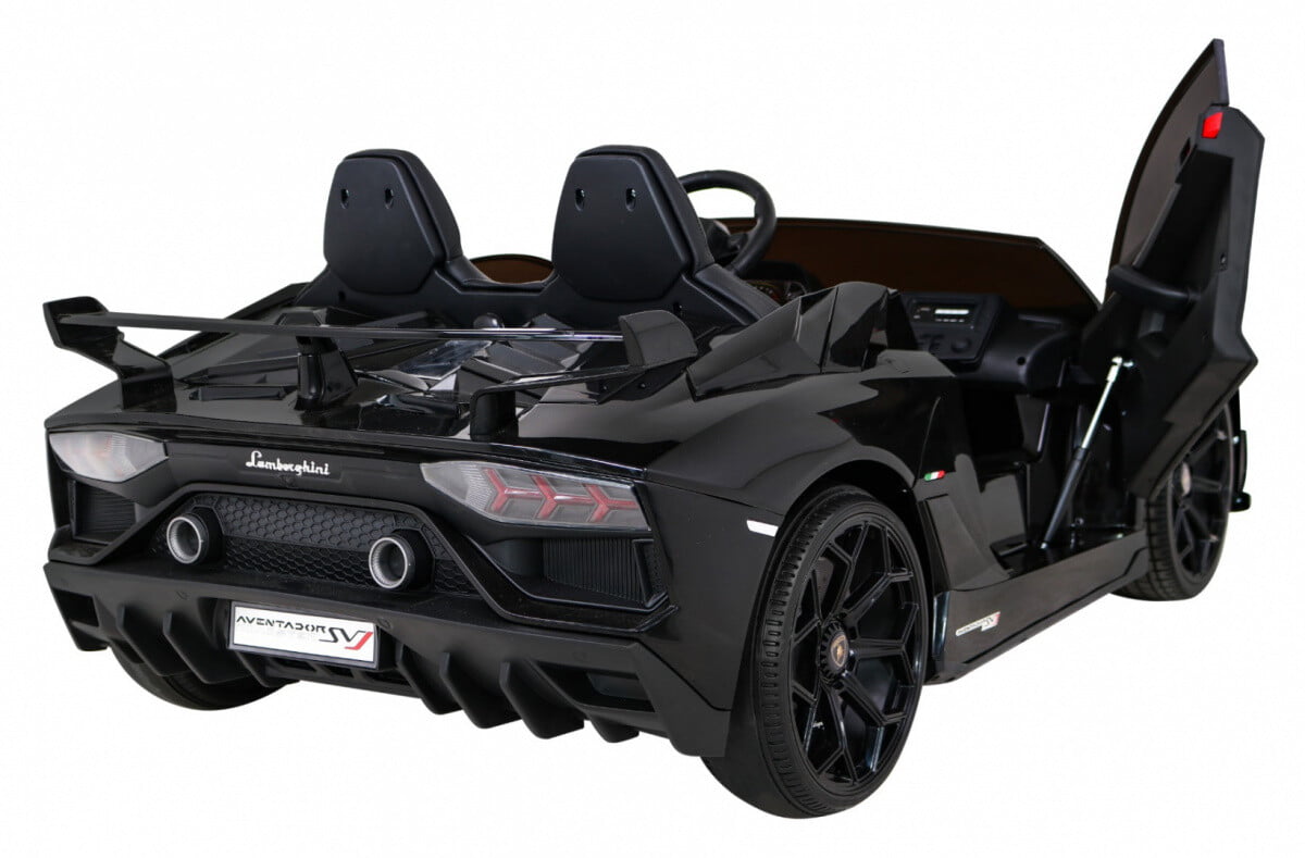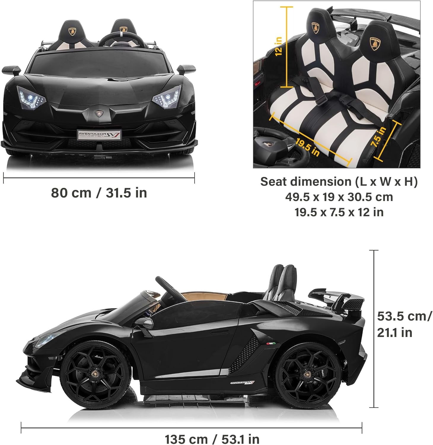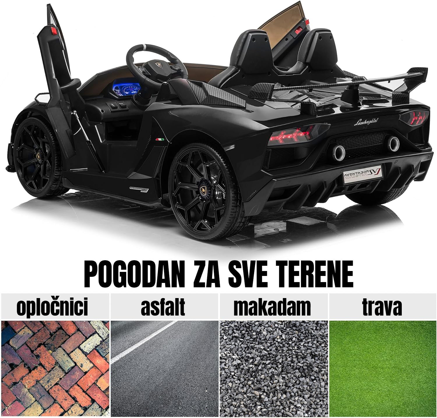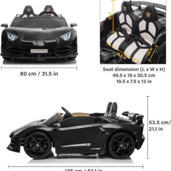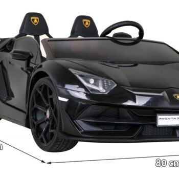 MODEL: Lamborghini SVJ roadster MOTOR: 2X 25000 vrt/min BATERIJA: 2 x 12V 7ah ŠTEVILO SEDEŽEV: dvosedežni MERE: dolžina 134 cm, širina 80 cm, višina 52 cm TEŽA: teža vozila – 28,7 kg, z embalažo – 34,2 kg, največja obremenitev – 60 kg OPREMA: