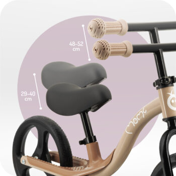 Predstavljamo vam poganjalčko MoMi ISOKA Ključne značilnosti: LED luči v kolesih: Kolesa so opremljena z LED lučkami, ki se aktivirajo z gibanjem, kar zagotavlja dodatno zabavo med vožnjo. Baterije niso potrebne, saj luči delujejo na principu dinama. Nastavljiva višina sedeža in krmila: Kolo raste z vašim otrokom zahvaljujoč enostavni nastavitvi višine sedeža in krmila brez uporabe orodja. Kolesa iz termoplastične gume (TPR): 10-palčna kolesa so izdelana iz TPR-ja, materiala, ki je trpežen in prožen, kar zmanjšuje udarce in zagotavlja udobno vožnjo. Nedrseči ročaji: Ročaji na krmilu imajo nedrsečo površino, ki zagotavlja varen in trden oprijem za majhne roke. Odsotnost zaklepa krmila: Za večjo varnost krmilo nima zaklepa, kar omogoča lažje manevriranje in zmanjšuje tveganje za poškodbe v primeru padca. Oporniki za noge: Zasnovani za udobje in varnost, oporniki omogočajo otroku, da med vožnjo navzdol nasloni noge, kar zmanjšuje tveganje za spotikanje. Tehnične specifikacije: Material okvirja: Jeklo Teža kolesa: 3,5 kg Največja obremenitev: Do 35 kg Priporočena starost: Za otroke od 2. leta starosti naprej Skladnost s standardi: EN 71-1, EN 71-2, EN 71-3 Poganjalec MoMi ISOKA v rjavi barvi je zasnovan tako, da zagotavlja varno, udobno in zabavno vožnjo, hkrati pa spodbuja telesni razvoj vašega otroka. Zaradi lahke in trpežne zasnove je idealen spremljevalec za vsako pustolovščino na prostem. Izberite MoMi ISOKA in svojemu otroku zagotovite nepozabne trenutke, polne veselja in učenja!