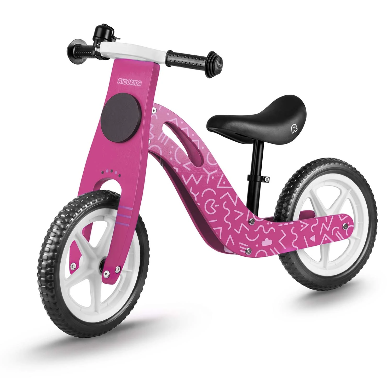 trpežen lesen okvir, nastavljiva višina sedeža, mehak penasti sedež, 12-palčna kolesa iz EVA pene, gumirani ročaji z zaporami, tabla za pisanje s kredo na volanu, zvonec.