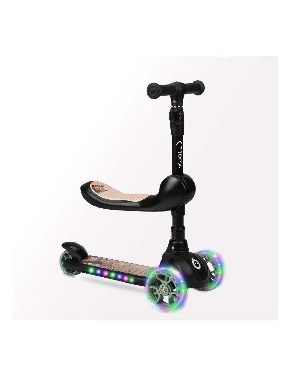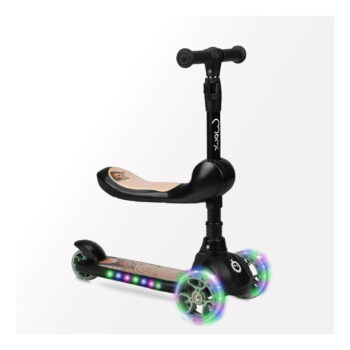 Funkcionalnost 2 v 1 – Enostavno se preoblikuje med skuterjem in vozičkom. LED svetleča kolesa in platforma – Luči za dodatno zabavo in vidljivost. Nastavljiva višina krmila – Tri stopnje nastavitve za optimalno udobje. Zložljiva zasnova – Kompaktno zlaganje za enostavno shranjevanje in transport. ⚖️ Sistem samouravnoteževanja – Stabilnost zagotavljajo tri kolesa. Nožna zavora – Varno in enostavno zaviranje za otroke. Lahka konstrukcija – Tehta le 2,3 kg za enostavno rokovanje. ️♂️ Največja nosilnost – Do 50 kg v načinu skuterja in do 20 kg v načinu vozička. Privlačna črna oblika – Elegantna in moderna rešitev za otroke.