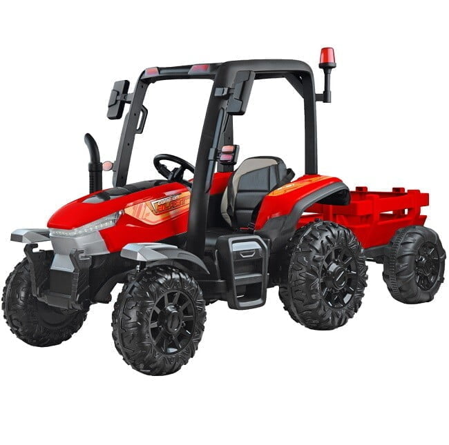Prednosti vozila: – traktor se zažene z rdečim gumbom – po zagonu otrok sliši brnenje motorja traktorja – traktor ima osvetlitev spredaj in zadaj, ki se izklopi s stikalom – osvetljena glasbena plošča ima možnost menjave pesmi, melodij veslanja, USB vhod – indikator napolnjenosti baterije obvešča o uporabi – volan s hupo – velika kolesa – streha – sprednji priključek – zadnja kljuka – stranska ogledala – sprednji pokrov baterije – stopnice, ki olajšajo vstop/izstop – 3-točkovni varnostni pasovi – udoben sedež z varnostnim pasom
