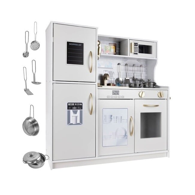 - KUHINJSKI PRIBOR ZA KUHINJSKEGA KUHARJA – komplet vsebuje 4 žlice – zajemalko, žlico za špagete, žlico z režami in žlico za testenine; lonec, ponev in pokrov . Pomivalno korito v pečici je mogoče odstraniti, otrok/starš ga lahko napolni z vodo in po igri pomije ‘umazano’ posodo.