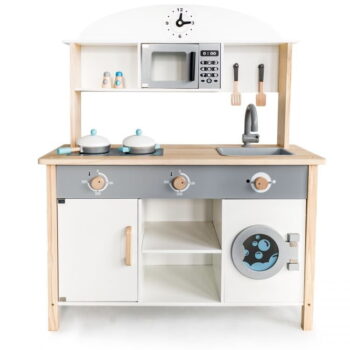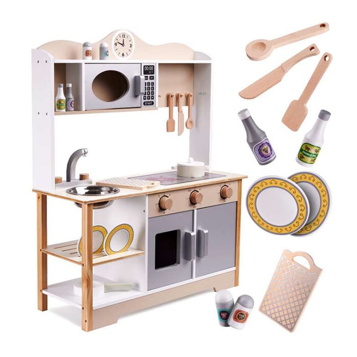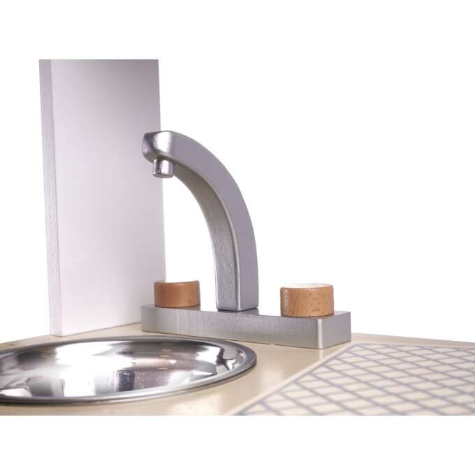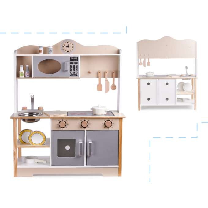 VELIKA LESENA KUHINJA ZA OTROKE Uporaba najboljših surovin za izdelavo kuhinje zagotavlja dolgo življenjsko dobo. Kuhinjski pult in noge so izdelani iz masivnega lesa, ostali elementi pa iz MDF-ja. Kuhinja je opremljena z vsem, kar potrebujete, vključno z: premično pipo, pomivalnim koritom, policami, omarico, gumbi na klik, uro, mikrovalovno pečico in pralnim strojem z odpiralnimi vrati. Poleg tega komplet vsebuje 8 kuhinjskih dodatkov (lonec, ponev, 2x lopatica, 2x pokrovka, poper, sol). Vsi leseni elementi so brez nevarnih robov. Višina: 85 cm Širina: 68 cm Globina: 25,5 cm. takojna voljokuhinje