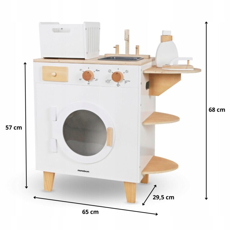 Predstavljamo vam lesen pralni stroj XXL z likalnikom, košaro in pomivalnim koritom – popolno igračo, ki otrokom omogoča posnemanje gospodinjskih opravil skozi igro, spodbuja njihovo ustvarjalnost in razvija motorične sposobnosti. Glavne značilnosti: