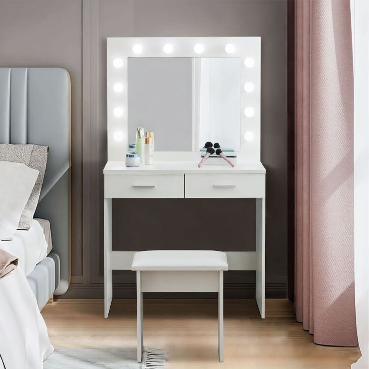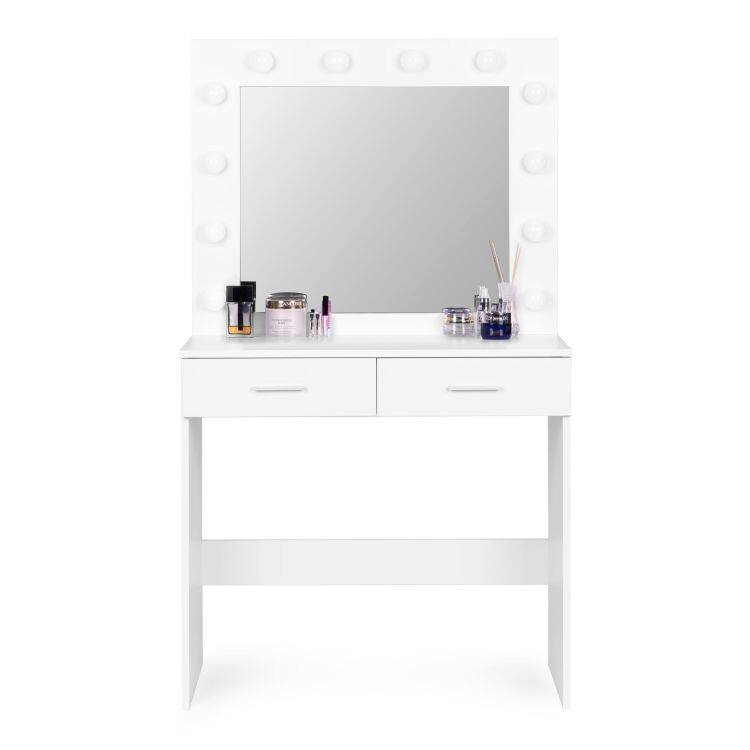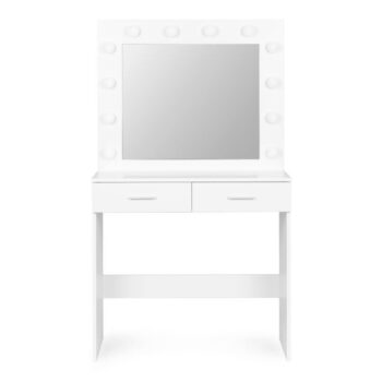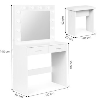 Velika, moderna kozmetična toaletna mizica z ogledalom in LED osvetlitvijo je odlična izbira za vsako žensko, ki ceni udobje in sodoben dizajn. Toaletna mizica ponuja varno in stabilno konstrukcijo, opremljeno z 12 LED žarnicami , ki zagotavljajo popolno osvetlitev za natančen nanos ličil. Ima veliko delovno površino in praktično ogledalo , zaradi česar je izjemno funkcionalna. Poleg tega dva velika izvlečna predala omogočata shranjevanje vseh potrebnih dodatkov za ličila in nakit. – stolček ni priložen toaletni mizici!