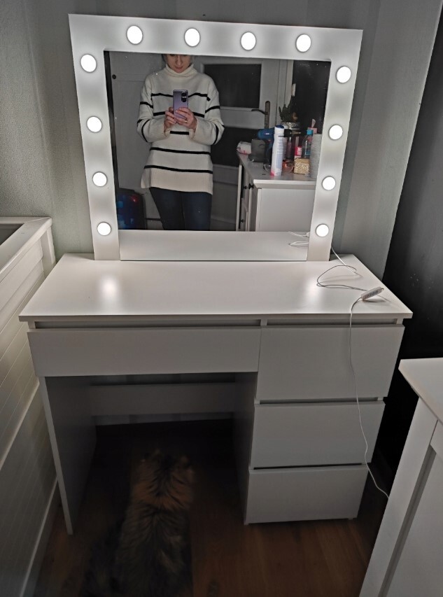 Izdelano iz visokokakovostne 18 mm laminirane plošče Ogledalo z 12 nevtralno belimi LED žarnicami ✅ CE certifikat Dimenzije: dolžina 94 cm x višina 140 cm x globina 43 cm